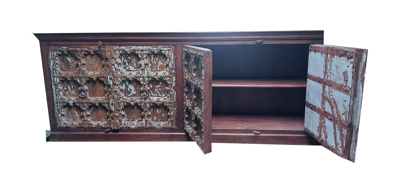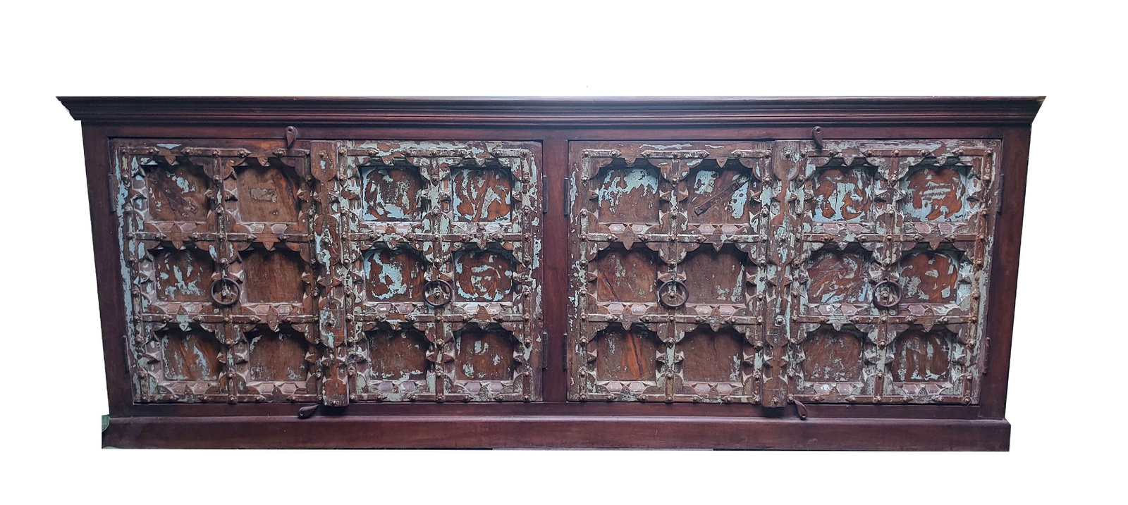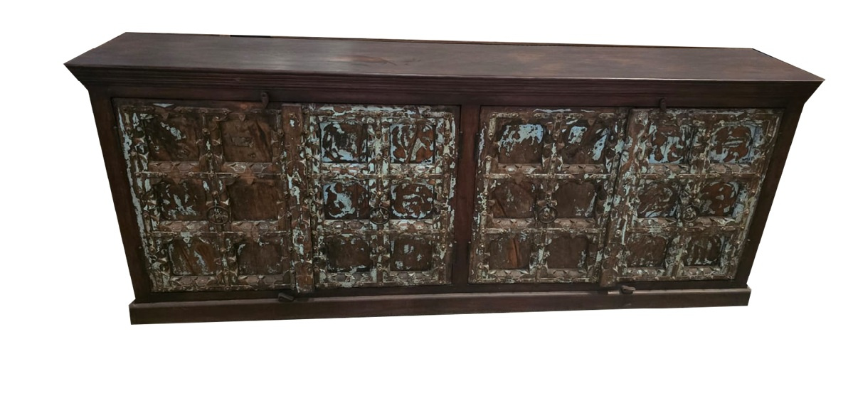 Unikatowa komoda indyjska wykonana ręcznie z litego drewna mango przez doświadczonych rzemieślników z Indii. Fronty zdobią stare, masywne elementy drewniane o wartości historycznej, co sprawia, że każdy egzemplarz jest jedyny w swoim rodzaju. Widoczne przetarcia i naturalna patyna nadają meblowi niepowtarzalny charakter, idealny do wnętrz w stylu orientalnym, boho czy eklektycznym.