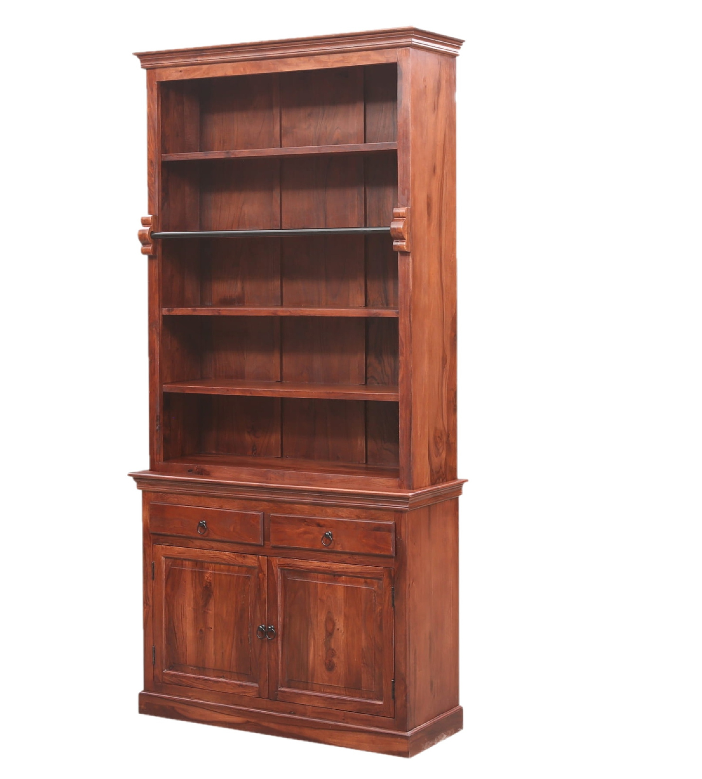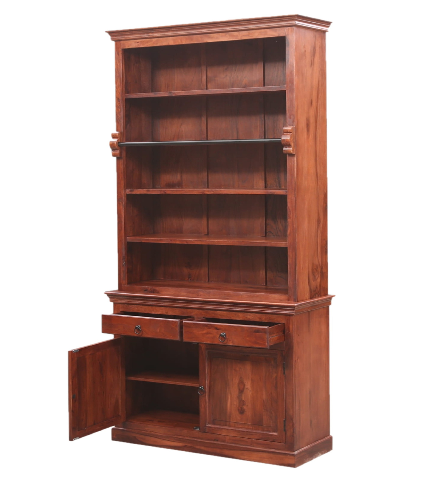 Każda biblioteka jest unikatowa, wykonana z naturalnego drewna palisandru (Sheesham), charakteryzującego się wysoką odpornością i niepowtarzalnym usłojeniem. To solidny mebel premium, który podkreśli elegancję salonu, gabinetu lub biblioteki domowej.