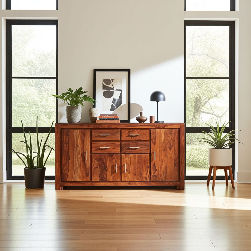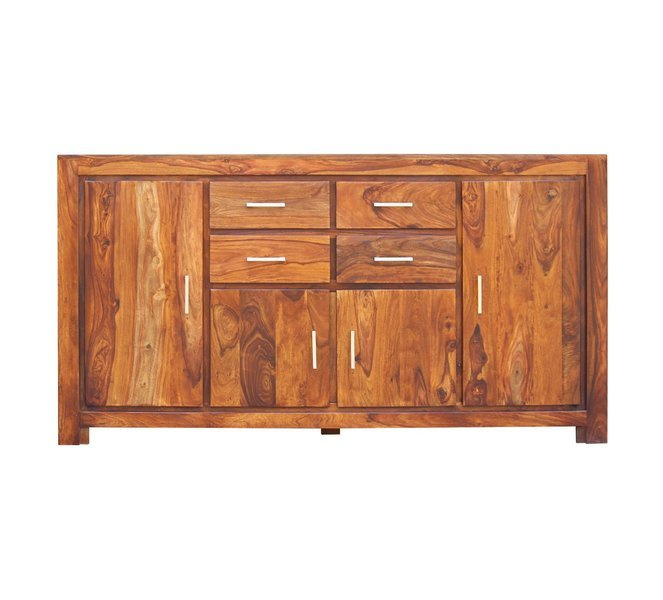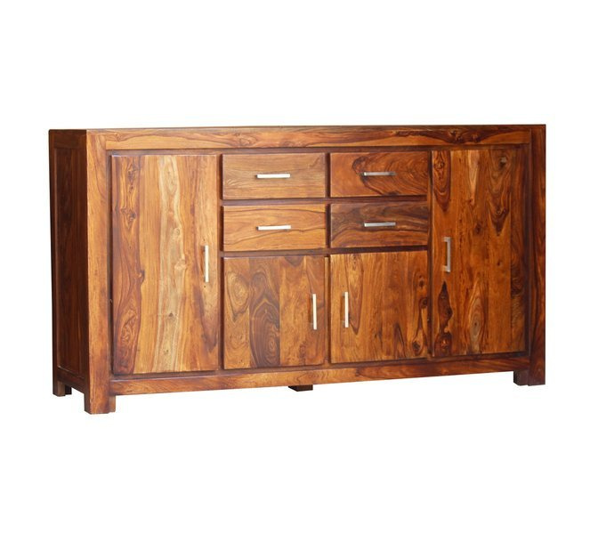 - Piękna, duża komoda w złocistym, ciepłym kolorze teak palisander. Niezwykle funkcjonalne rozłożenie czterech małych szuflad oraz dwóch większych i dwóch mniejszych szafek. Sprawdzi się w przechowywaniu przedmiotów o różnych rozmiarach. Idealna do salonu.