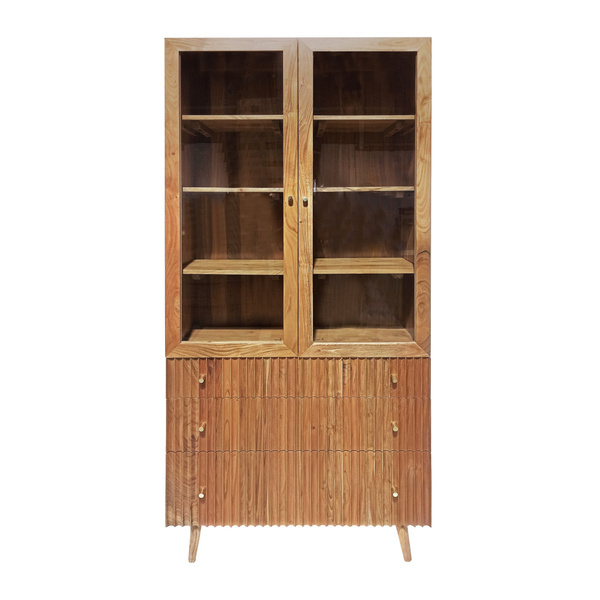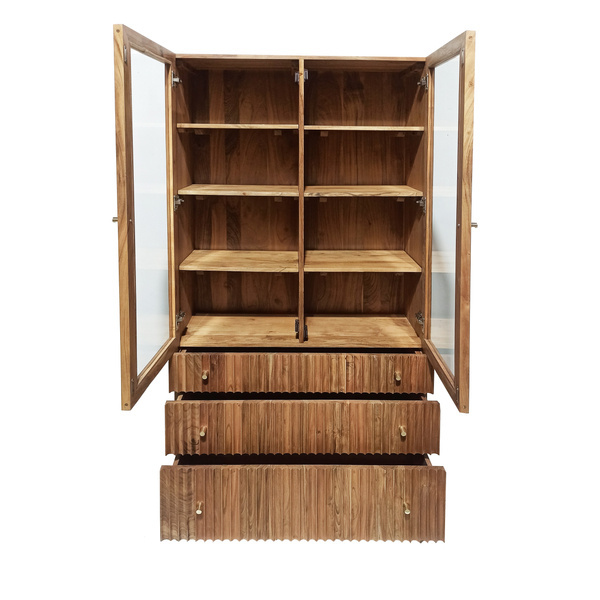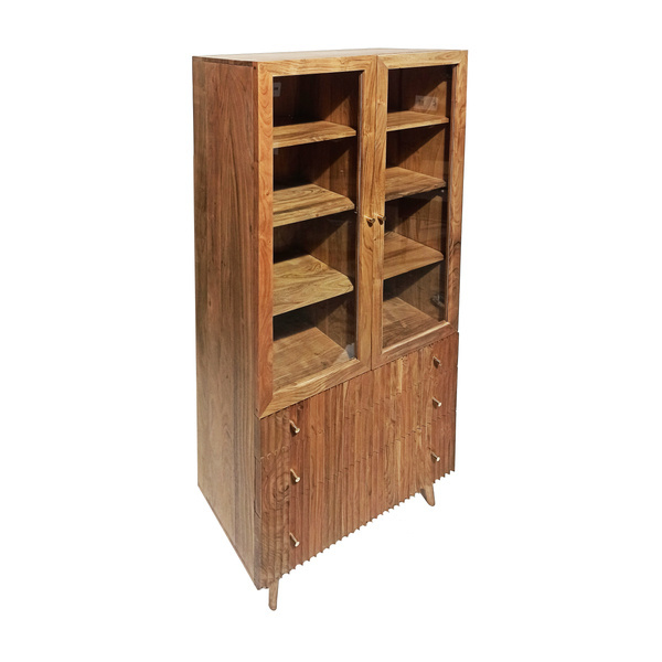 - Elegancka, modernistyczna witryna z naturalnego drewna akacji, łączy w sobie funkcję ekspozycyjną oraz funkcję przechowywania. Fronty szuflad zdobią pionowe żłobienia ala lamele, w górnej części mebla z łatwością zaprezentujesz urokliwe dodatki.