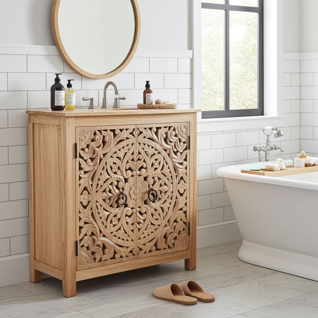 Opis mebla: Jest to drewniana komoda z drewna mango z misternie wyrzeźbionymi motywami. Wzory przedstawiają kwiaty i liście, a całość jest symetryczna, z centralnym motywem w kształcie koła. Komoda jest ręcznie wykonana, co czyni ją interesującym i unikalnym dodatkiem do wnętrza salonu. Jeśli szukasz czegoś nietuzinkowego, ta komoda może być doskonałym wyborem!