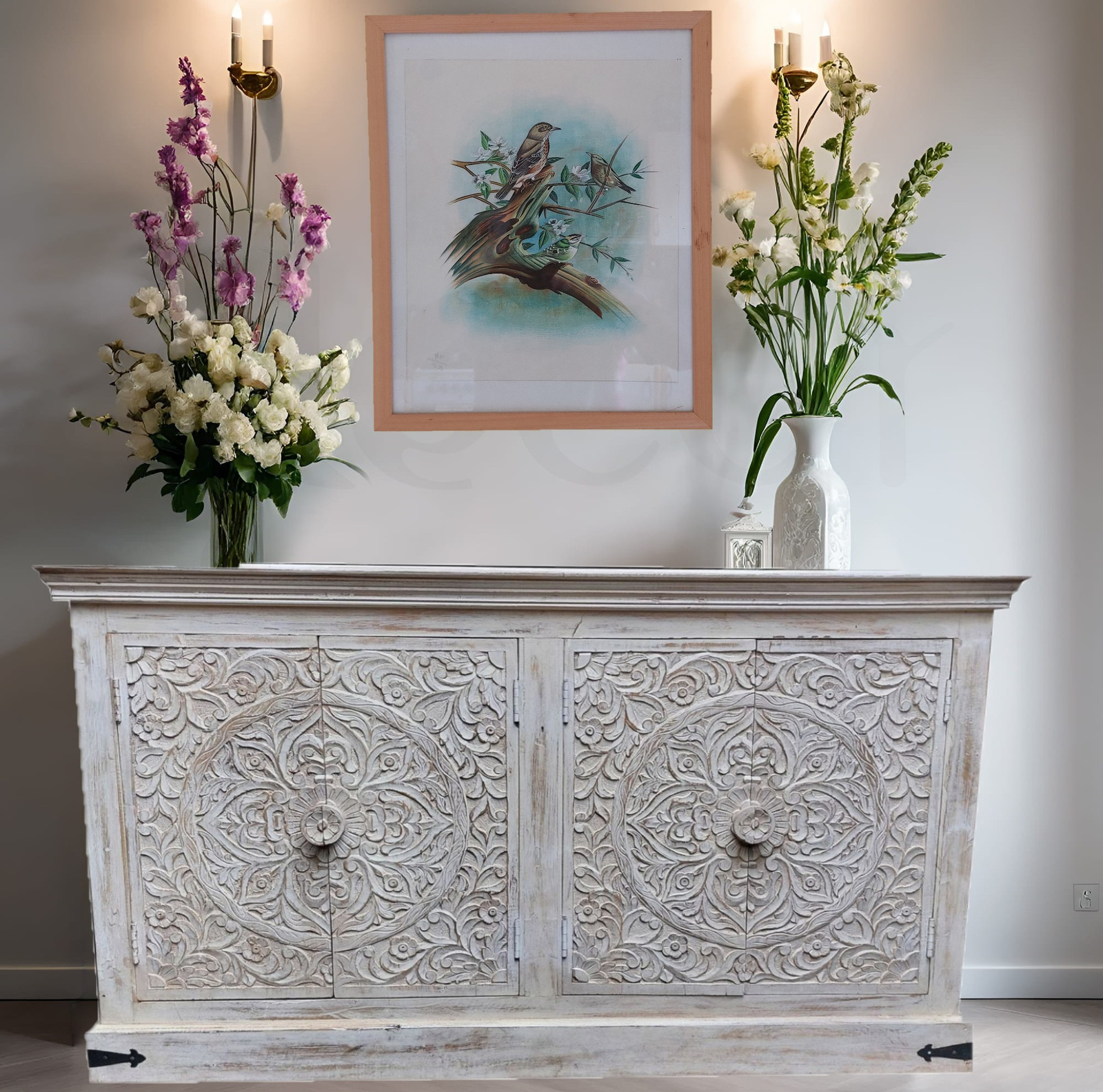 Opis mebla: Jest to drewniana komoda z drewna mango z misternie wyrzeźbionymi motywami. Wzory przedstawiają kwiaty i liście, a całość jest symetryczna, z centralnym motywem w kształcie koła. Komoda jest ręcznie wykonana, co czyni ją interesującym i unikalnym dodatkiem do wnętrza salonu. Jeśli szukasz czegoś nietuzinkowego, ta komoda może być doskonałym wyborem!
