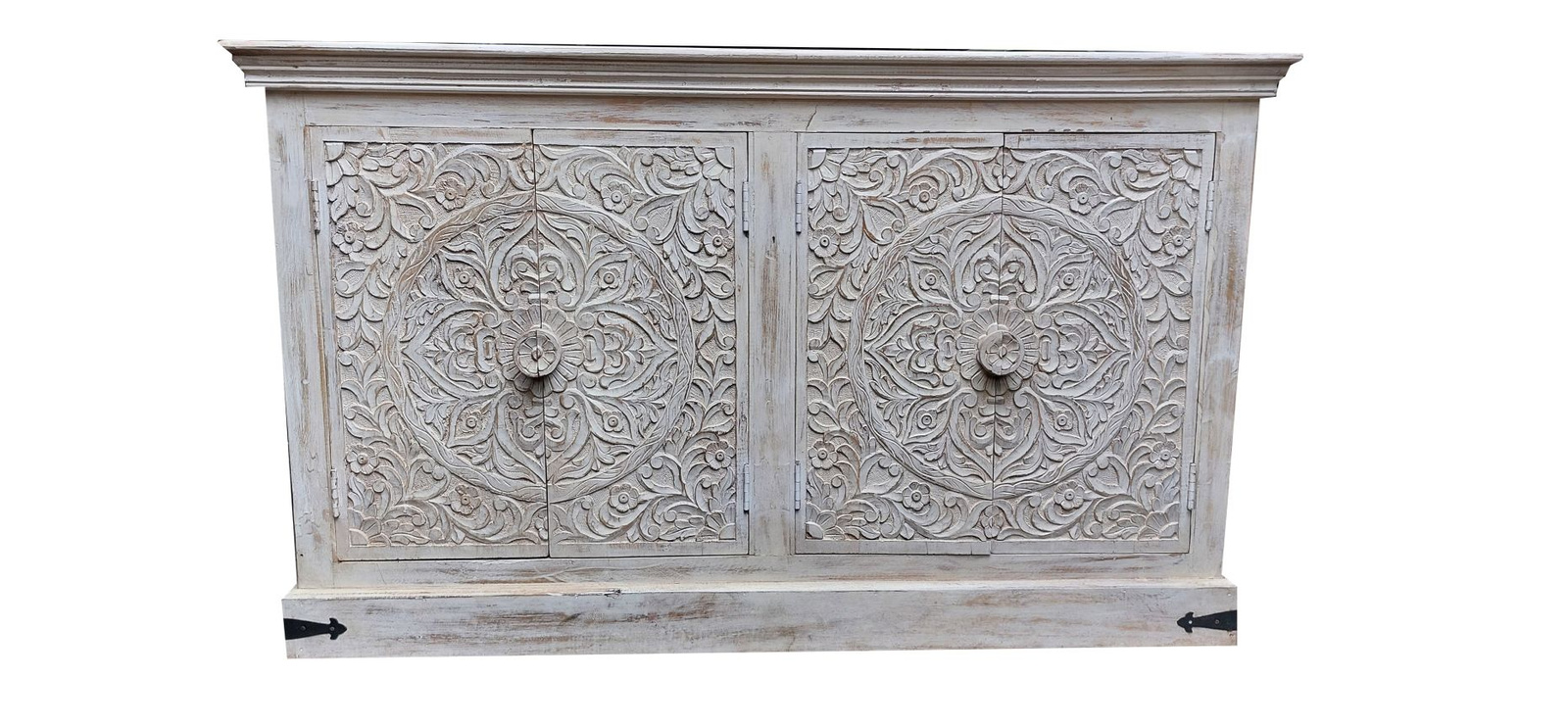 - Komoda z drewna mango rzeźbiona bielona WCDS-4-140-MN .