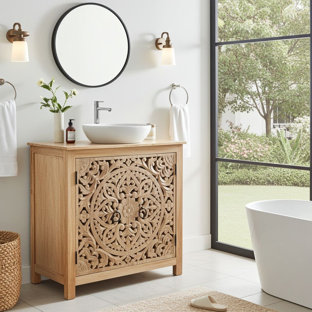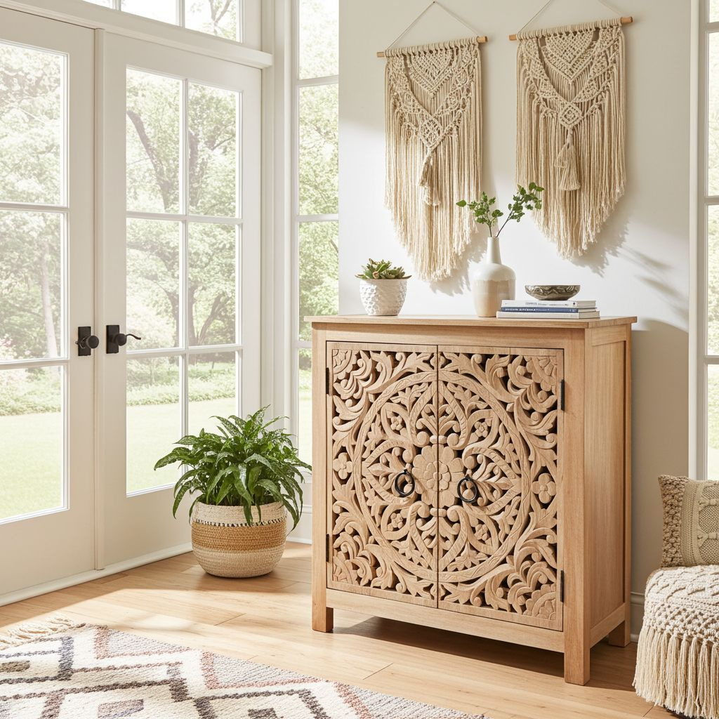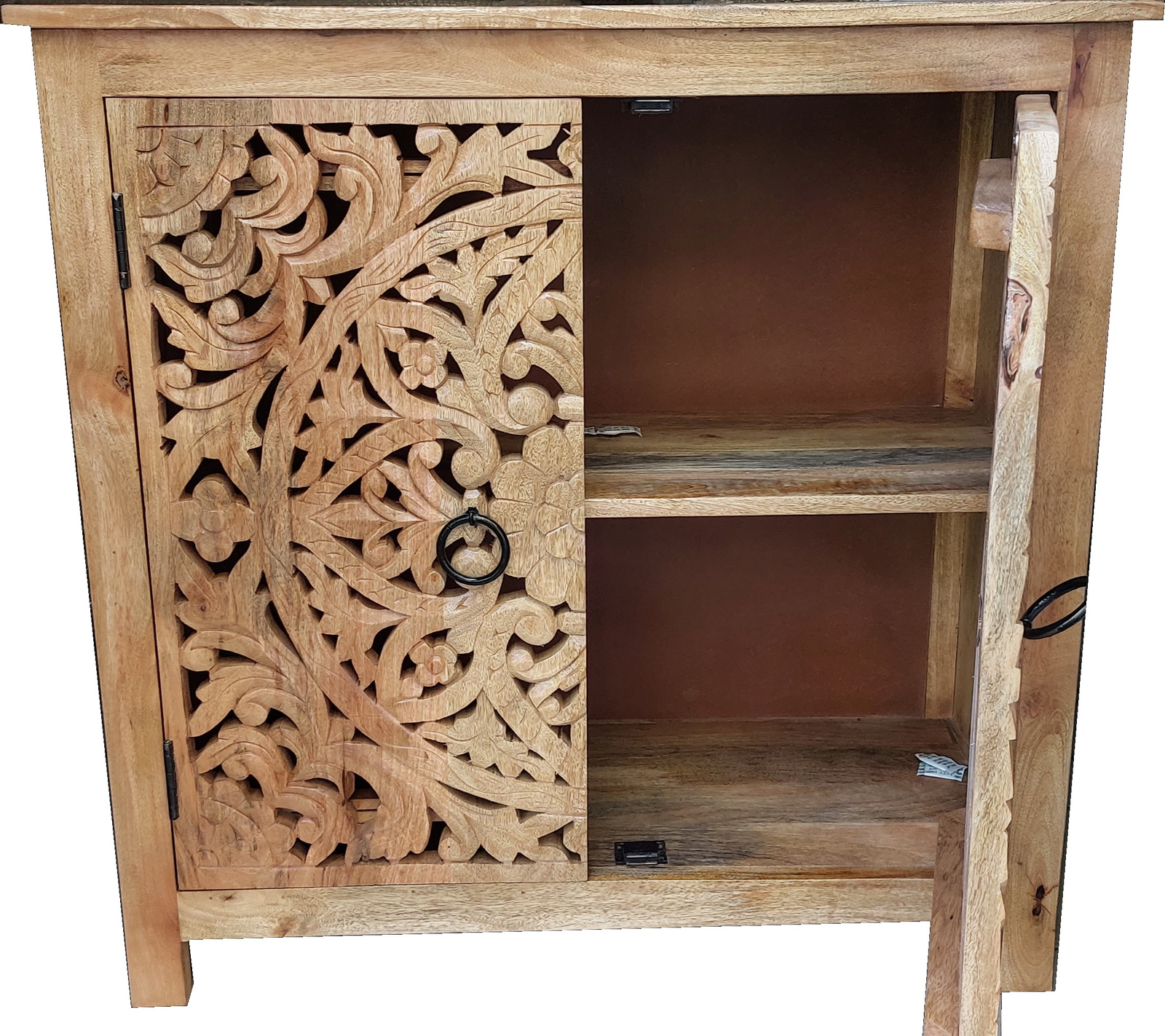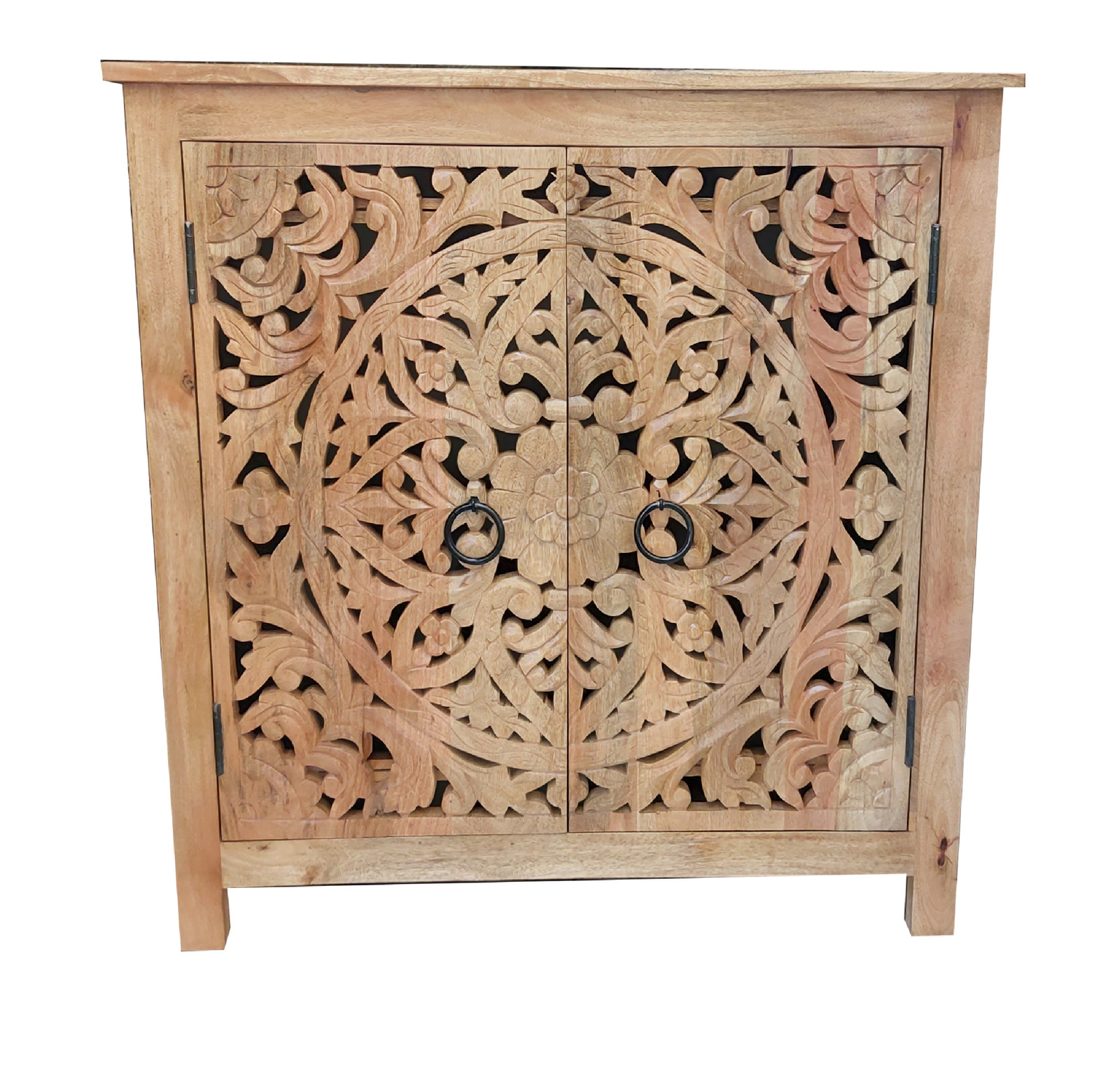 Opis mebla: Jest to drewniana komoda z drewna mango z misternie wyrzeźbionymi motywami. Wzory przedstawiają kwiaty i liście, a całość jest symetryczna, z centralnym motywem w kształcie koła. Komoda jest ręcznie wykonana, co czyni ją interesującym i unikalnym dodatkiem do wnętrza salonu. Jeśli szukasz czegoś nietuzinkowego, ta komoda może być doskonałym wyborem!