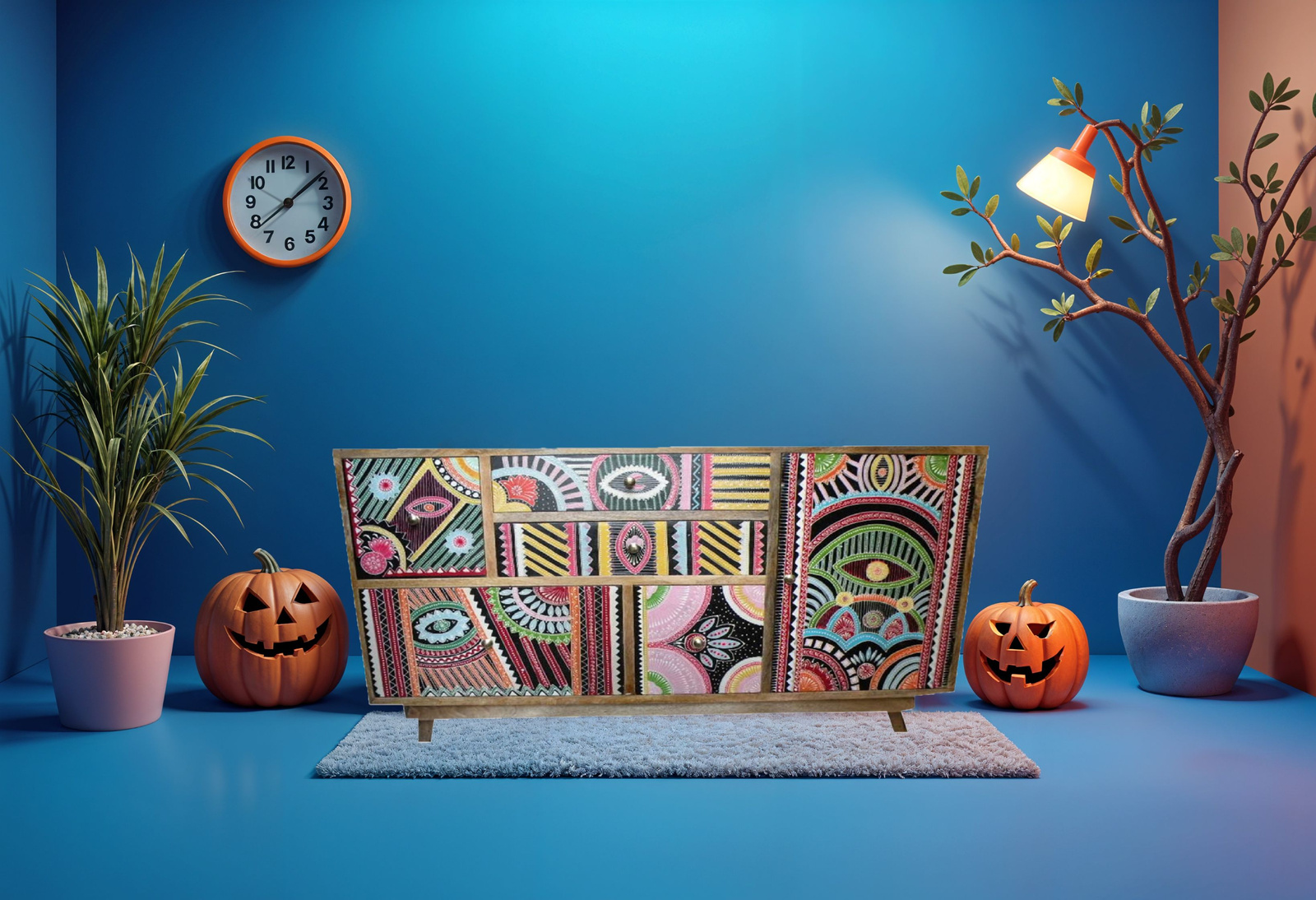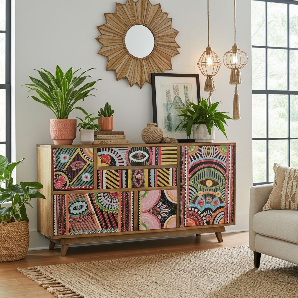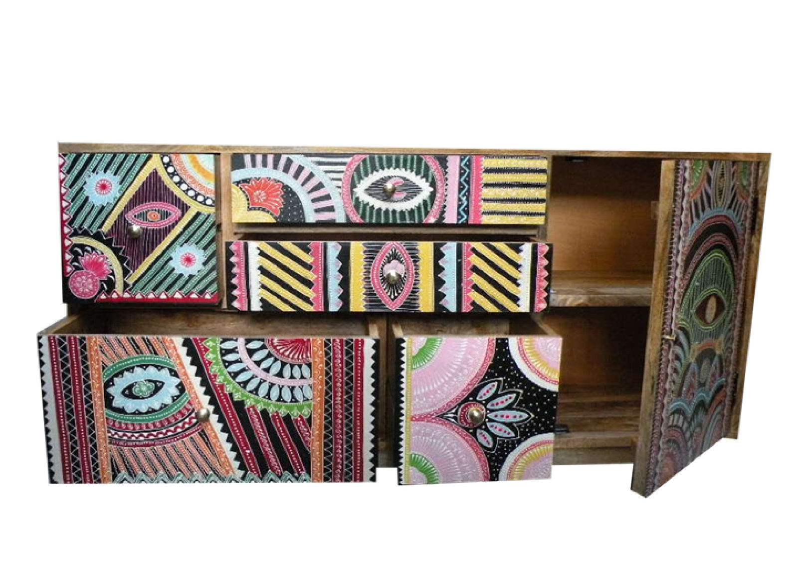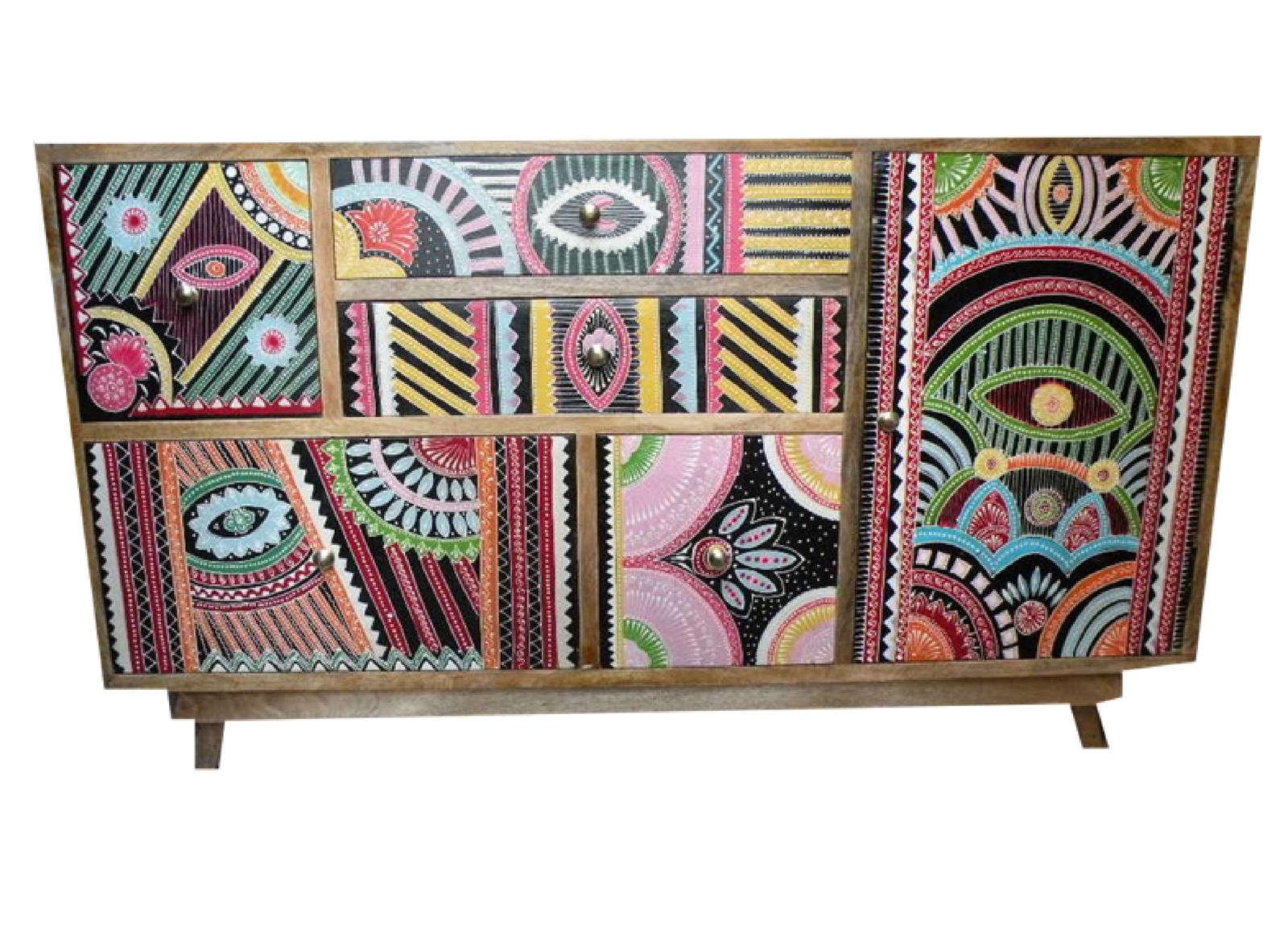 Bogata paleta kolorów, geometryczne wzory i etniczne motywy nadają komodzie niepowtarzalny charakter, a jednocześnie wprowadzają do wnętrza ciepło i egzotyczny klimat. Solidna konstrukcja z drewna mango gwarantuje trwałość, a ręczne zdobienia sprawiają, że każdy egzemplarz jest unikalny.
