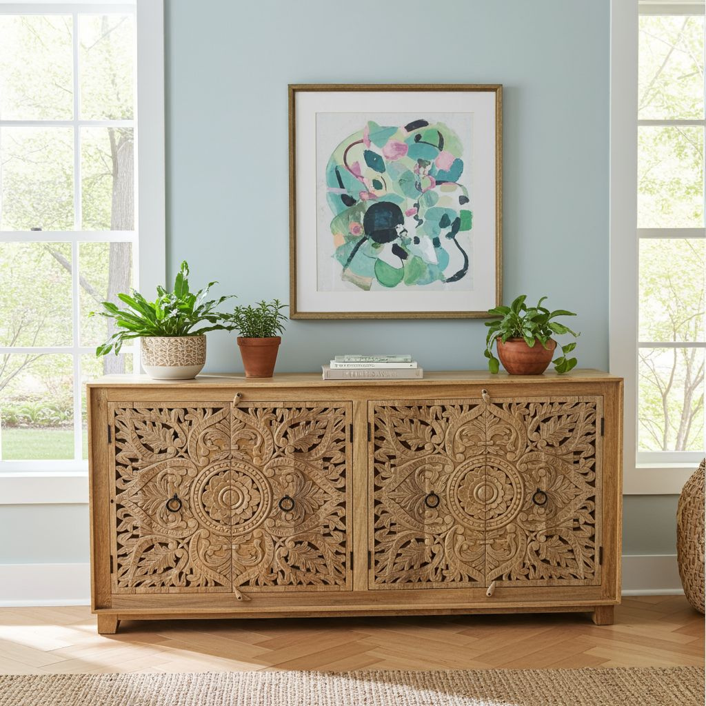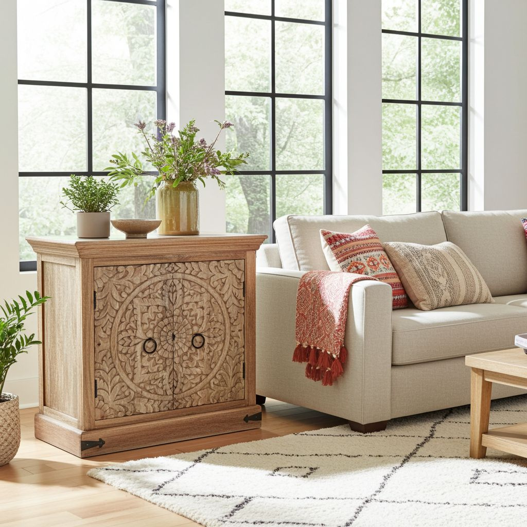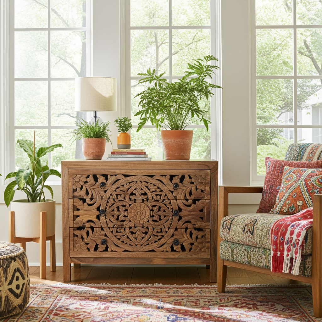Opis mebla: Jest to drewniana komoda z drewna mango z misternie wyrzeźbionymi motywami. Wzory przedstawiają kwiaty i liście, a całość jest symetryczna, z centralnym motywem w kształcie koła. Komoda jest ręcznie wykonana, co czyni ją interesującym i unikalnym dodatkiem do wnętrza salonu. Jeśli szukasz czegoś nietuzinkowego, ta komoda może być doskonałym wyborem!