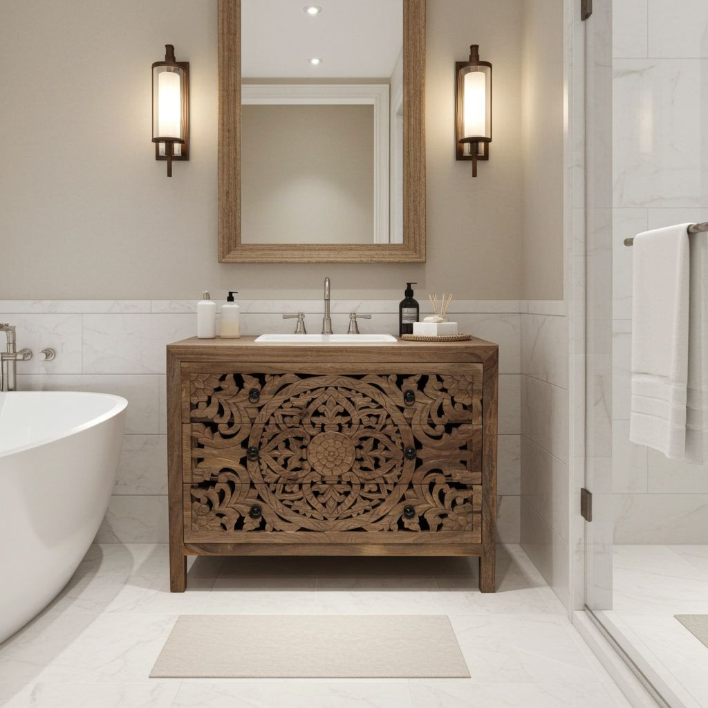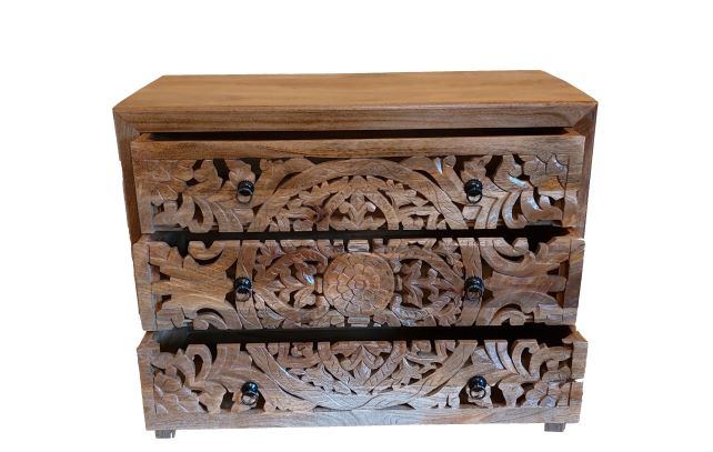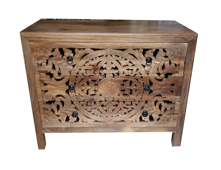 Opis mebla: Jest to drewniana komoda z misternie wyrzeźbionymi motywami na przedniej ścianie. Wzory przedstawiają kwiaty i geometryczne kształty, a całość wykonana jest z drewna mango. Komoda ma symetryczny design i szczegółowe wykonanie.Fronty szuflad są ozdobione ręcznie wyrzeźbionymi panelami. Ten mebel może stanowić zarówno praktyczne miejsce do przechowywania, jak i estetyczny punkt centralny w sypialni lub salonie. Doskonale pasuje w łazience.