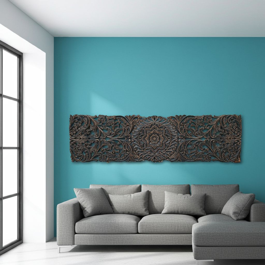 - Ręcznie rzeźbiony panel ścienny z drewna mango 180 cm – unikalna dekoracja z Indii, idealna jako ozdoba ściany lub wezgłowie łóżka. Orientalny styl i naturalne piękno.