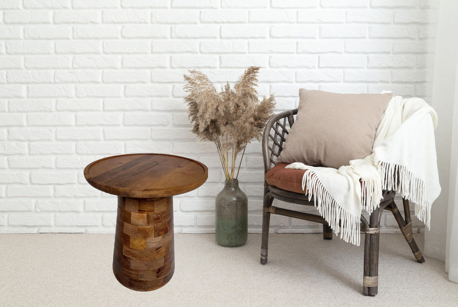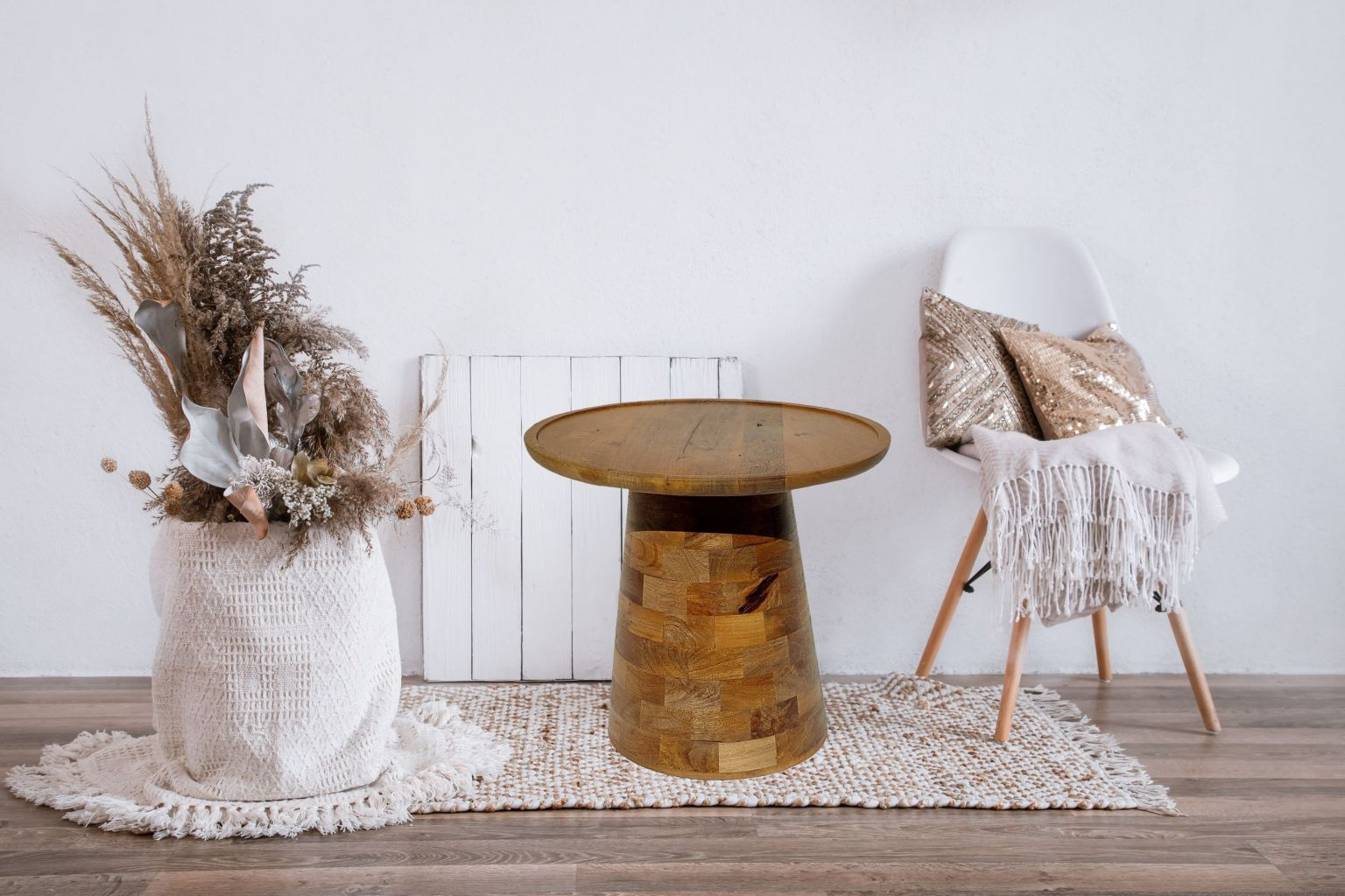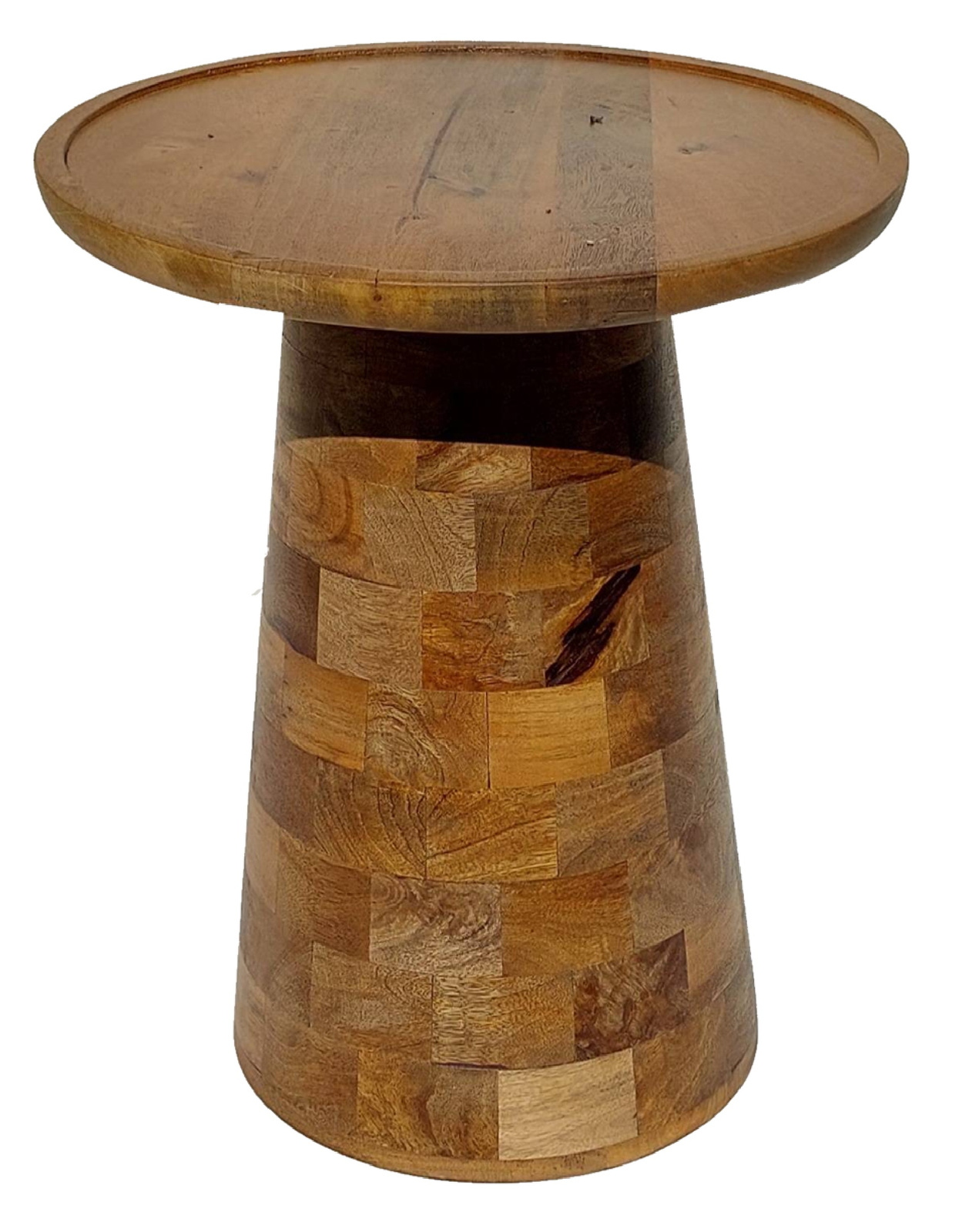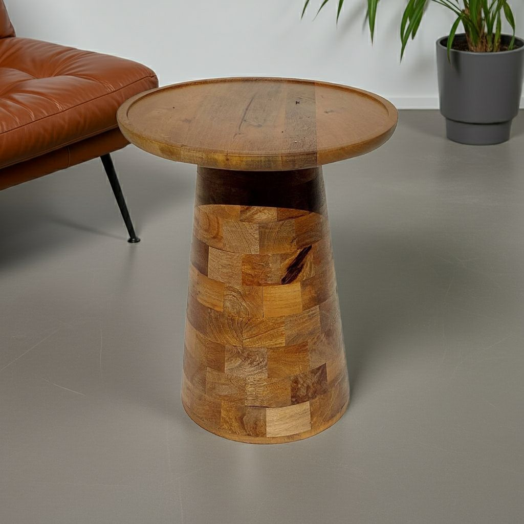 Blat wykonany został z litego drewna mango, które słynie z pięknej, ciepłej barwy oraz widocznego rysunku słojów. Największą ozdobą stolika jest jego oryginalna noga w kształcie stożka, zbudowana z ręcznie układanych kawałków drewna, co nadaje mu unikalny charakter i sprawia, że każdy egzemplarz jest jedyny w swoim rodzaju.