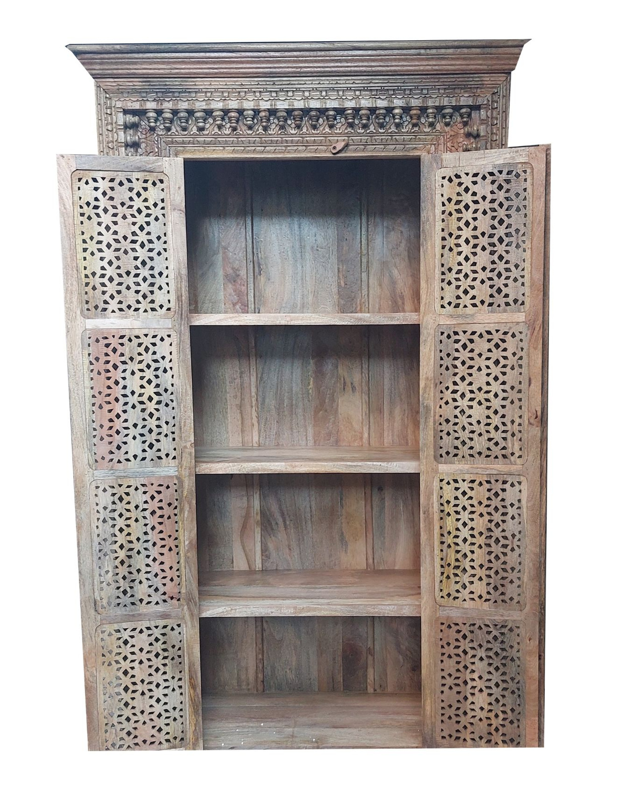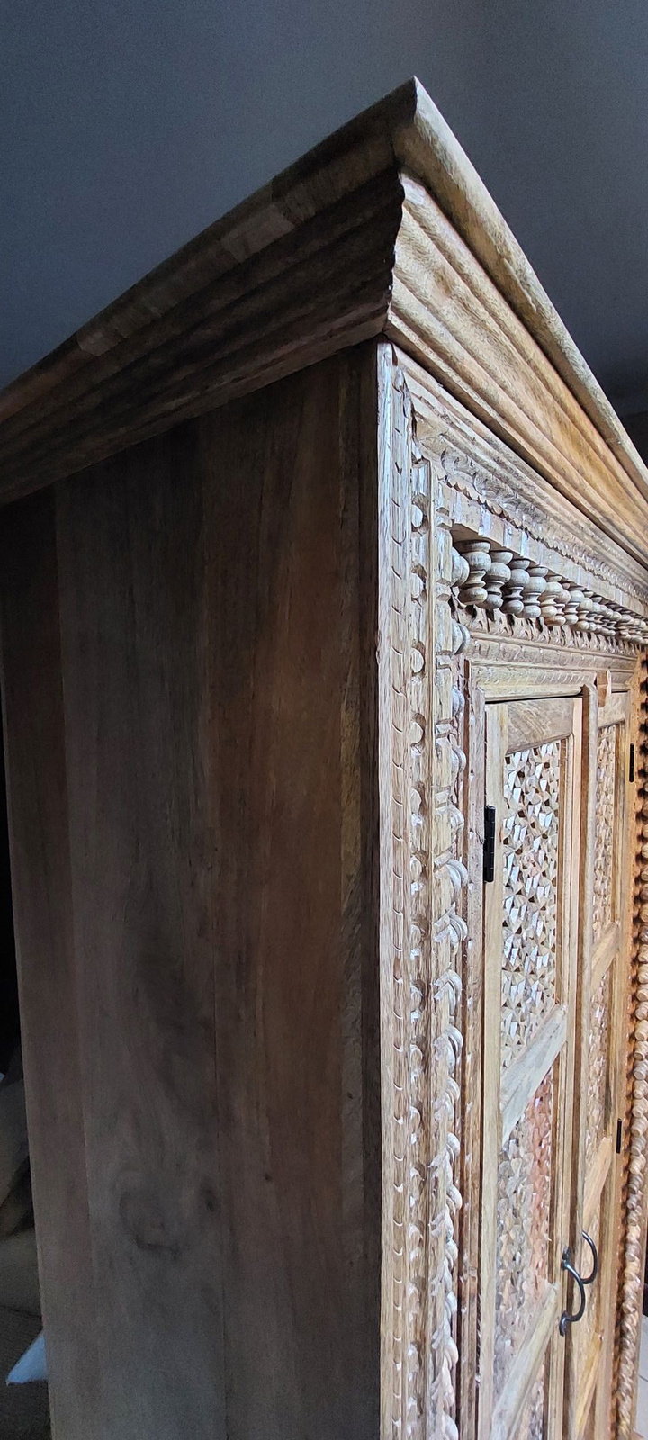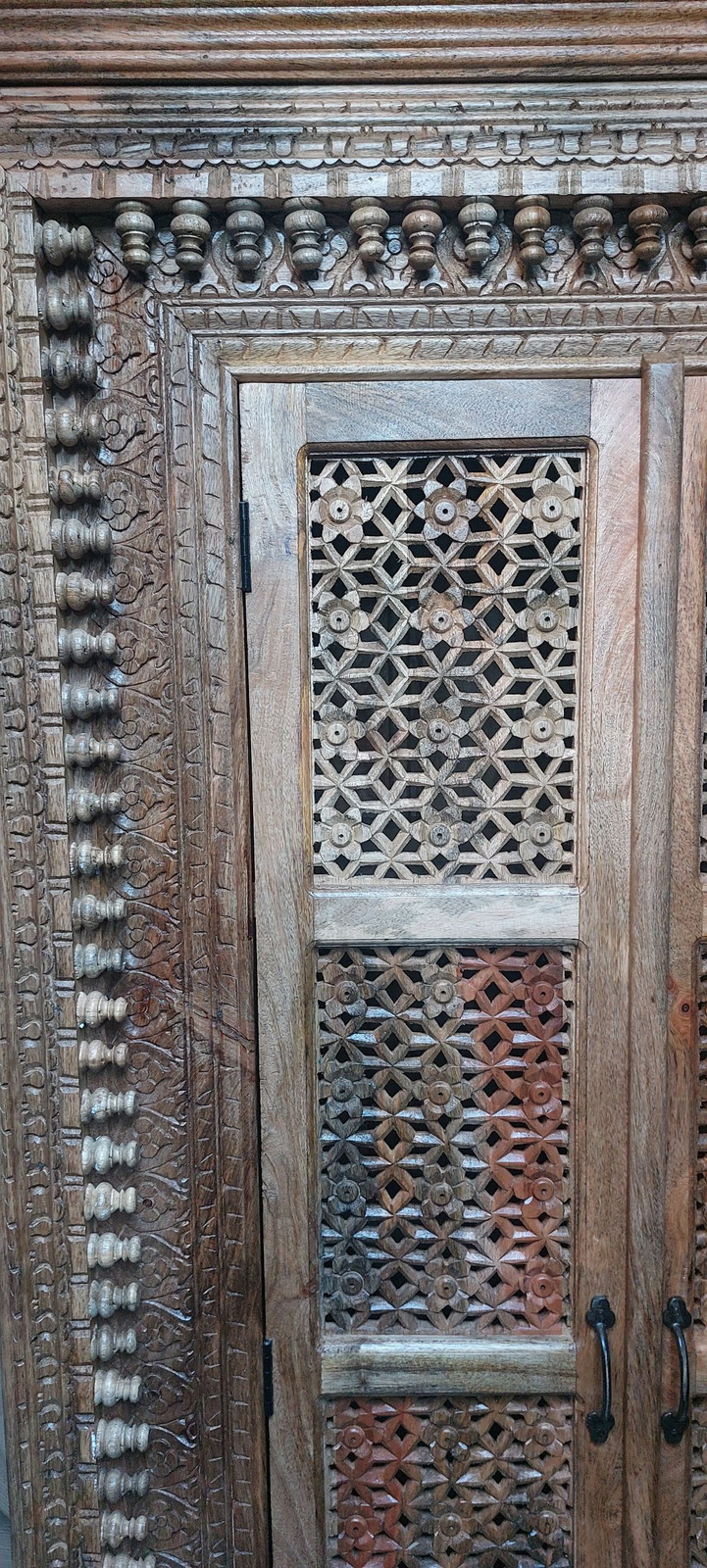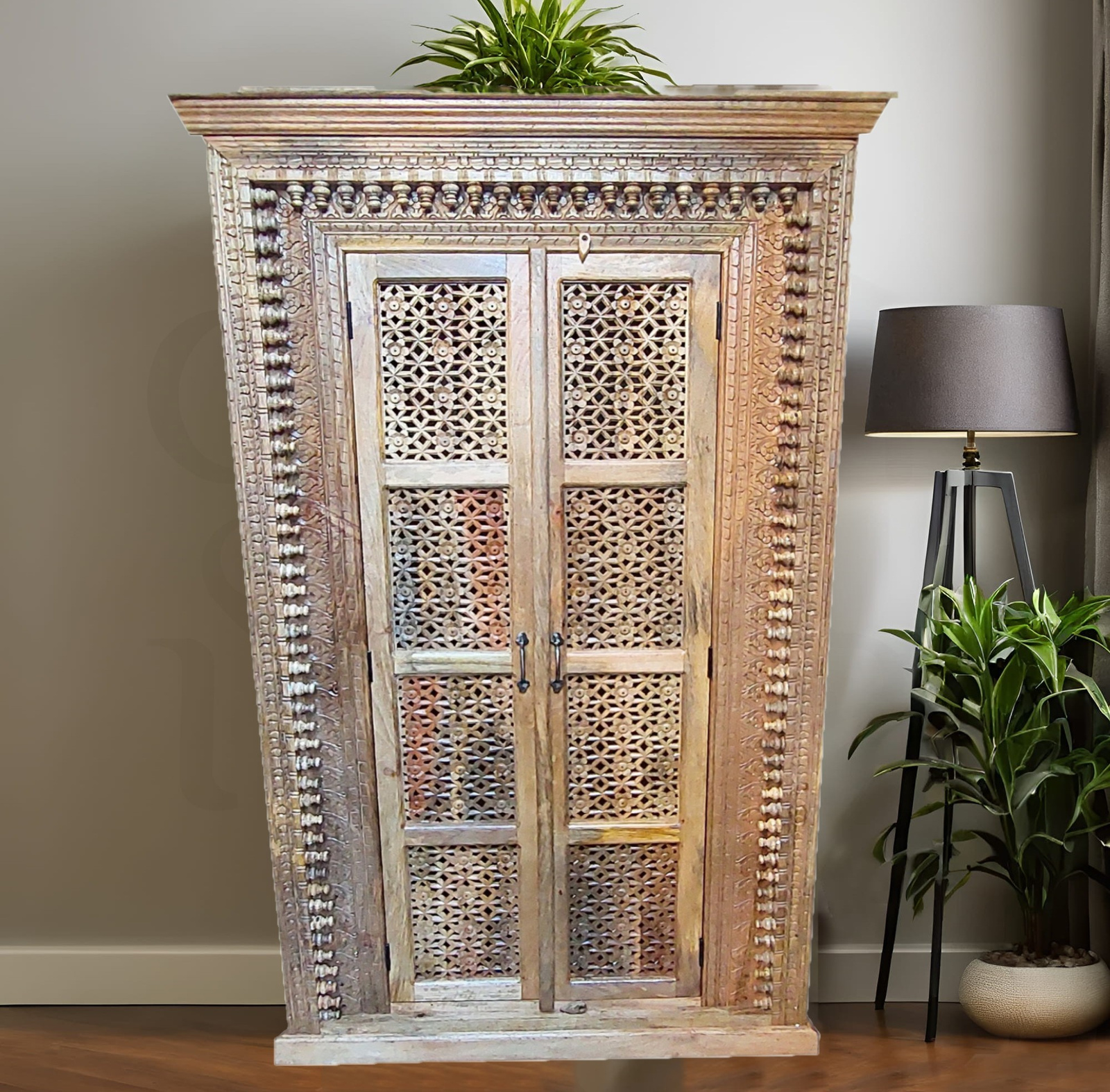 Indyjska Szafa z Drewna Mango – Ręcznie Rzeźbiona z Ażurowymi Drzwiami