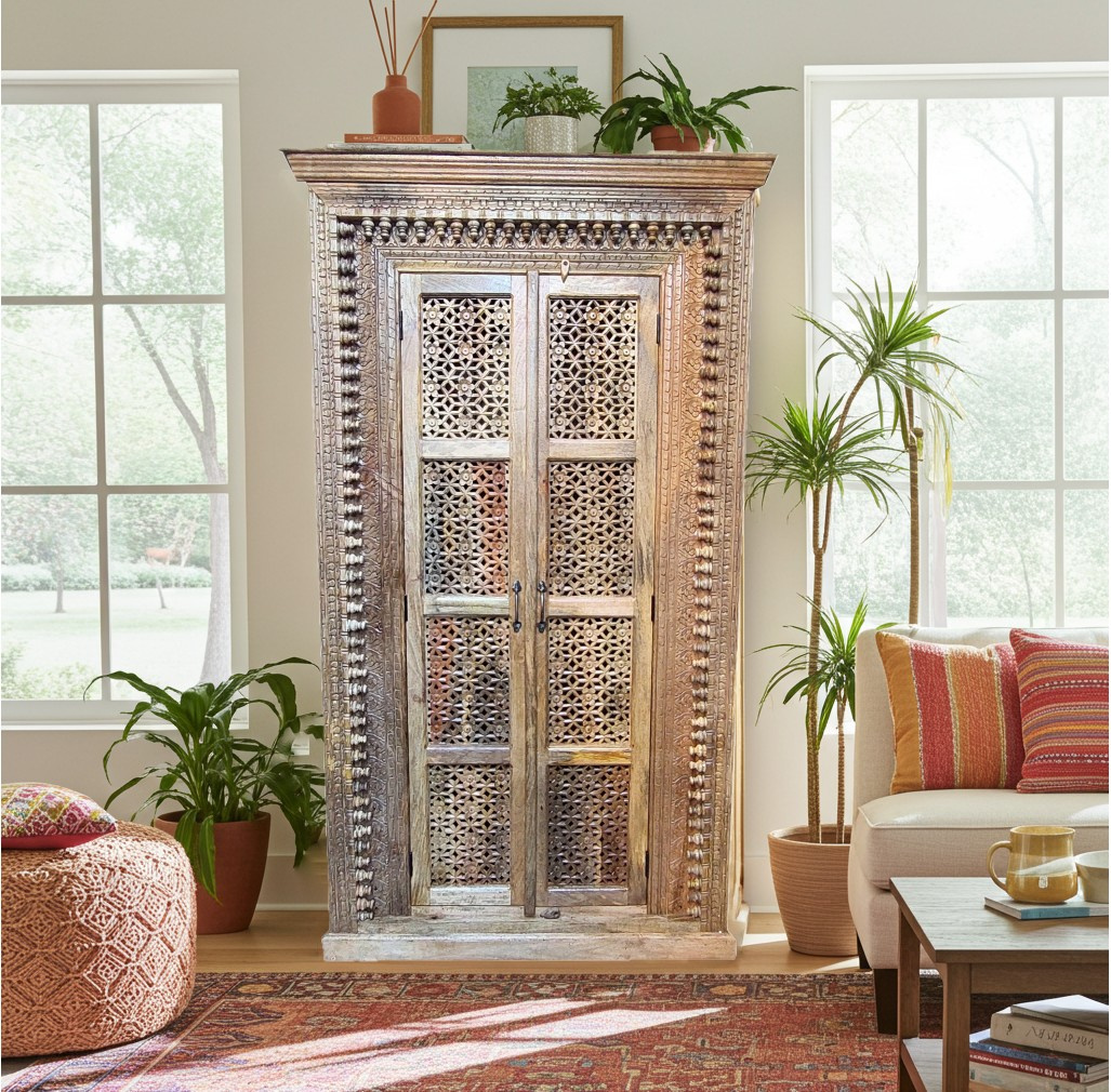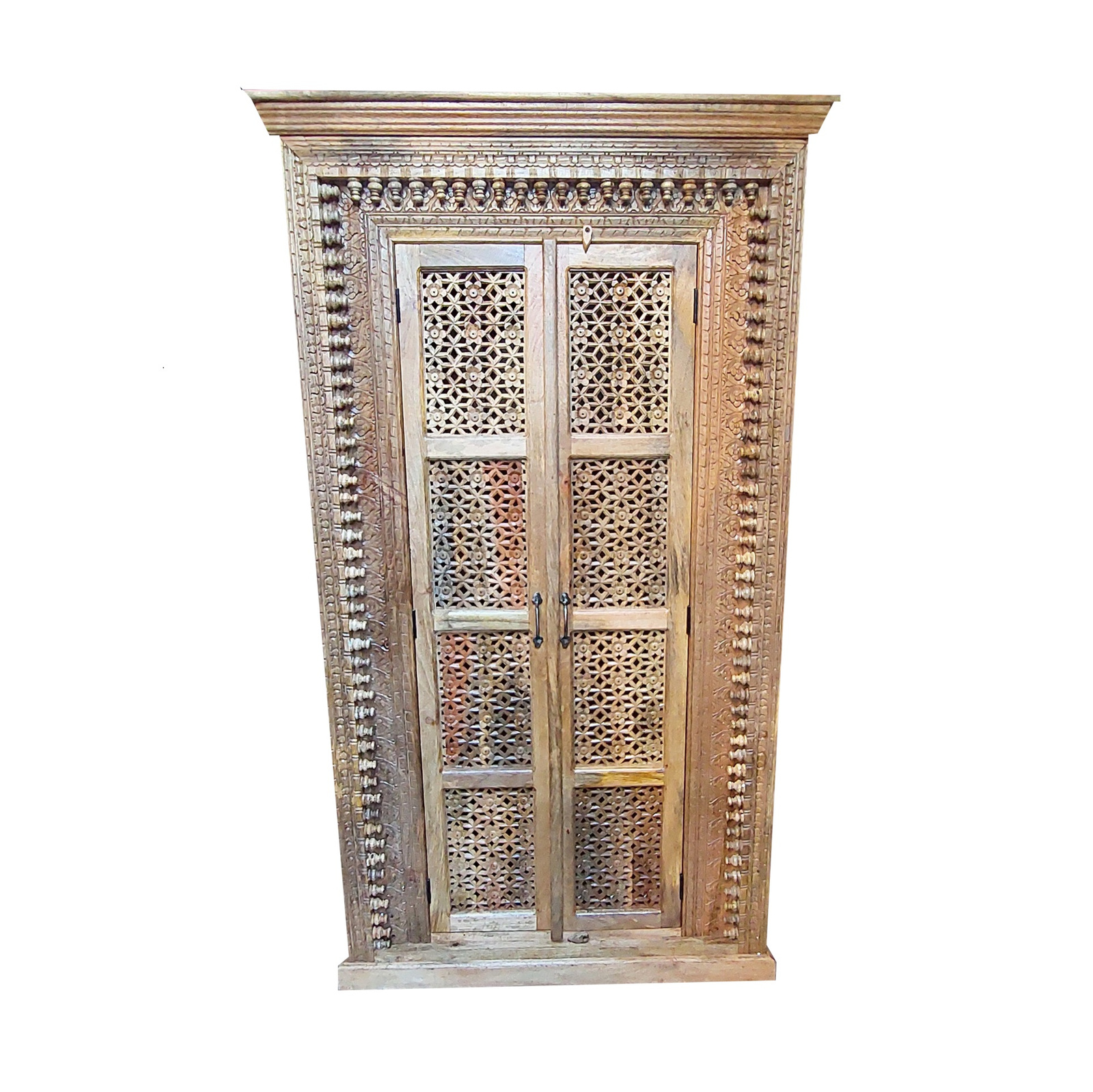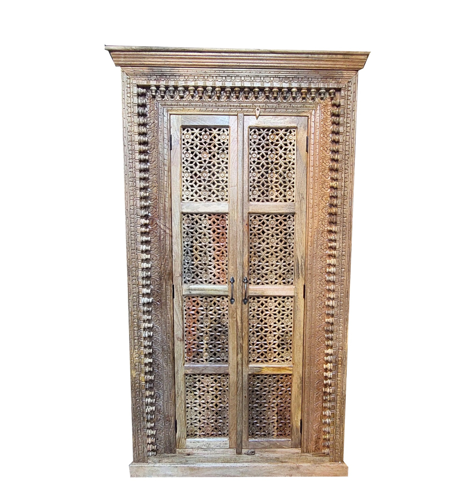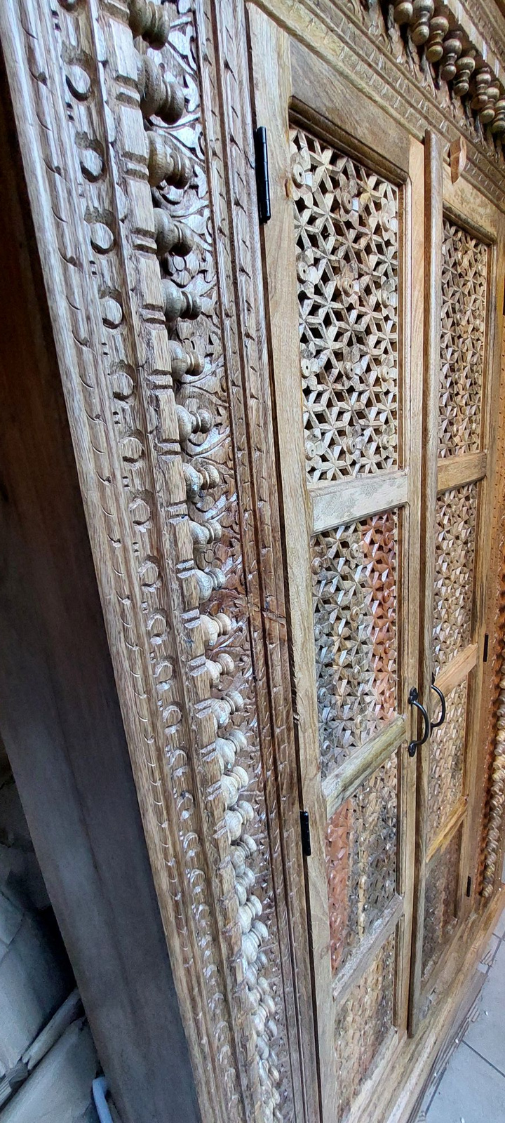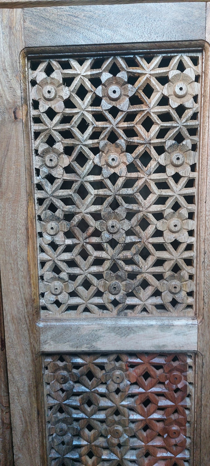 Indyjska Szafa z Drewna Mango – Ręcznie Rzeźbiona z Ażurowymi Drzwiami