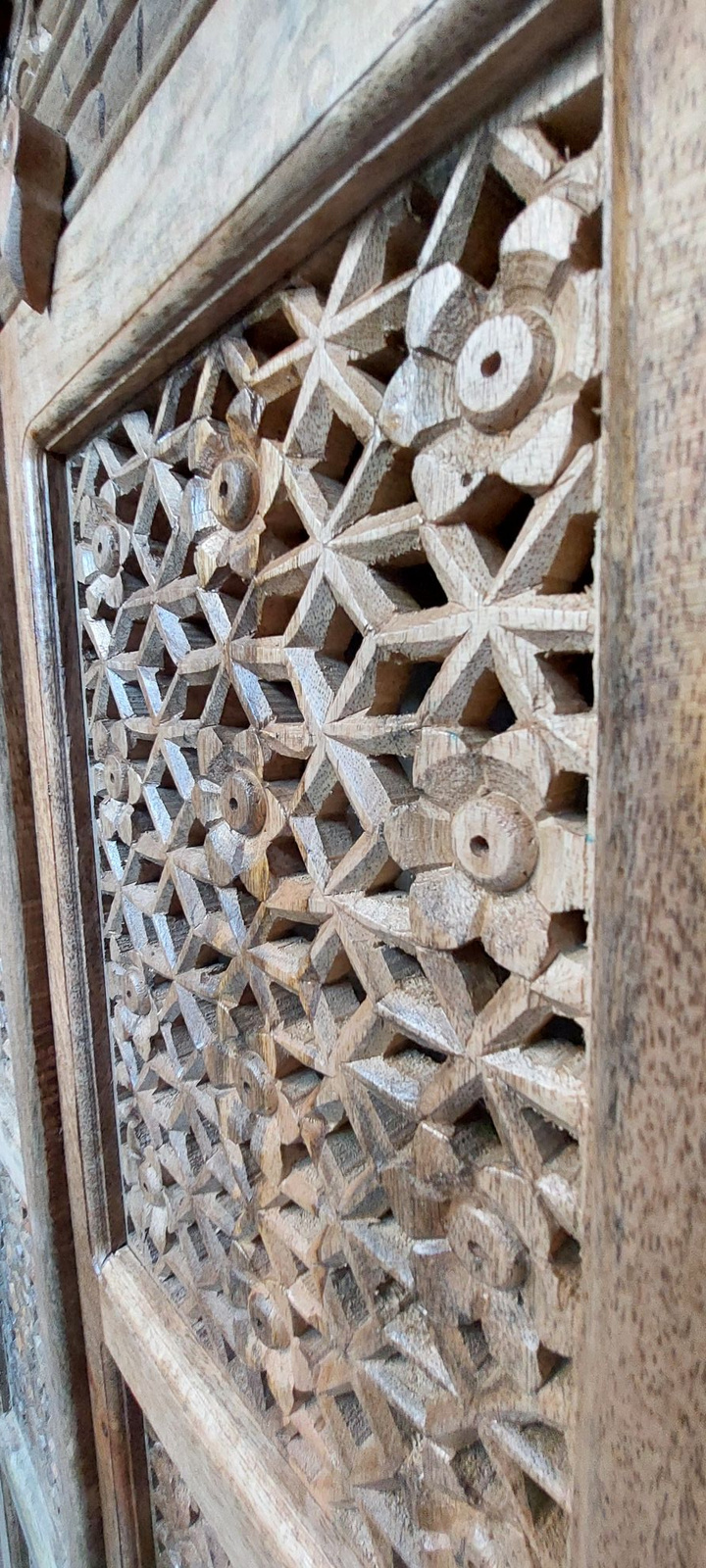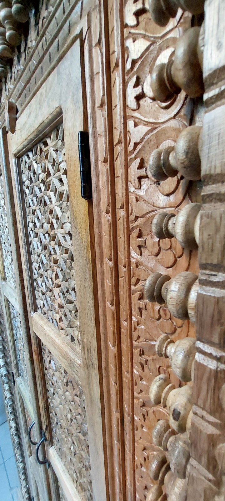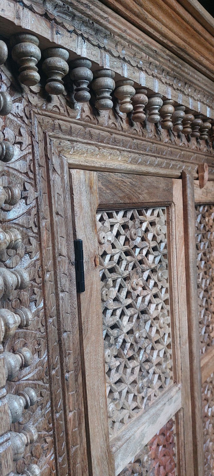 Solidna konstrukcja i naturalne wykończenie drewna podkreślają jego autentyczny charakter, a bogato zdobione ornamenty nadają mu artystycznego i eleganckiego wyglądu. Ażurowe drzwi nie tylko stanowią ozdobę, ale także zapewniają przewiewność – idealne do przechowywania tekstyliów, naczyń czy innych przedmiotów.