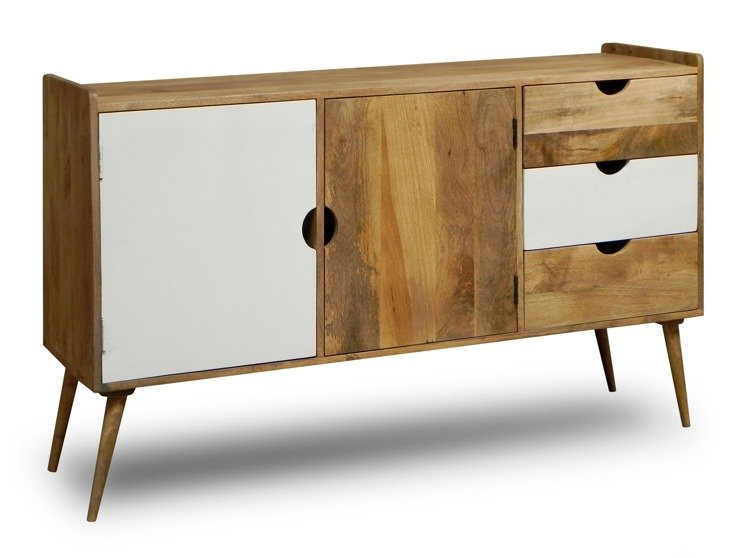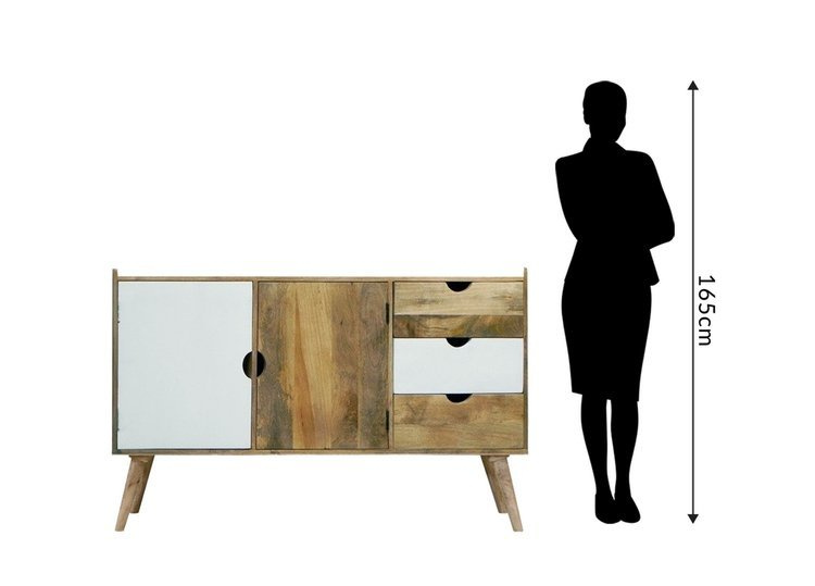 - Pochwała dla praktyczności – pojemna dwudrzwiowa komoda, trzy duże szuflady oraz wysokie nóżki, ułatwiające sprzątanie pod meblem. Bez obaw, funkcjonalność komody idzie w parze z cieszącym oko designem. Piękno naturalnego drewna i delikatne białe detale.