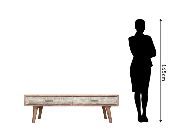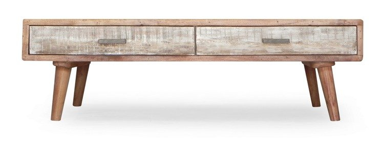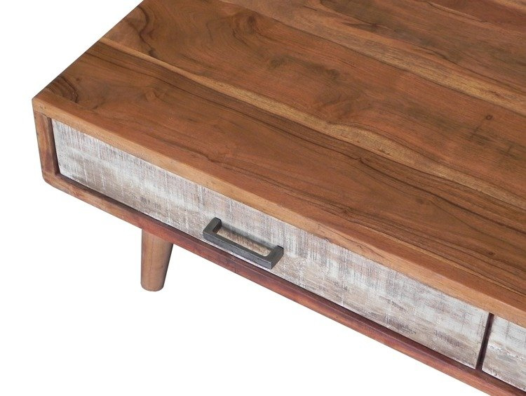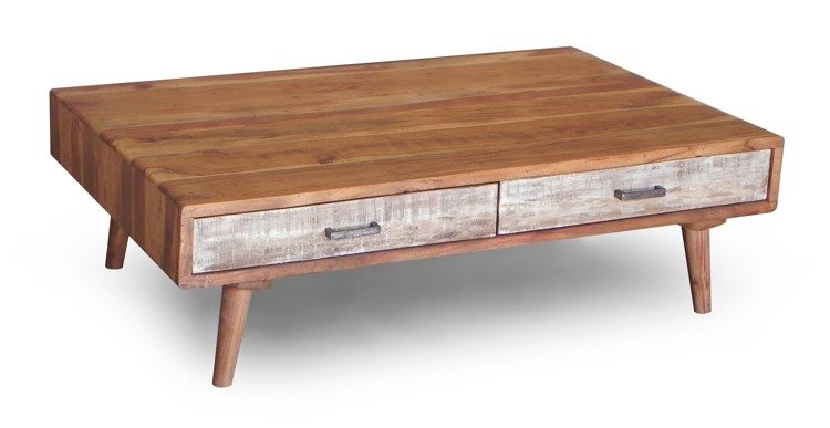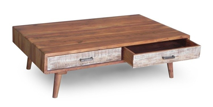 - Niezwykły stolik kawowy, gwarantujący uzyskanie spektakularnego efektu w każdym salonie. Dwie szuflady pomogą w utrzymaniu porządku, dzięki nim z łatwością ukryjesz drobne przedmioty codziennego użytku. Drewno w dwóch kolorach to ciekawy wizualnie zabieg.