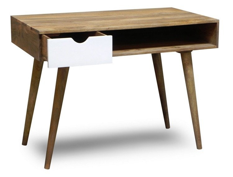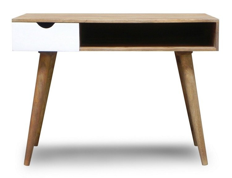 - Biurko z kolekcji Oslo z obszerną półką i białą szufladą to ponadczasowy mebel w stylu skandynawskim. Dzięki niewielkim wymiarom biurka z łatwością wkomponujesz je w każde wnętrze. Długie toczone nogi powodują, że całość prezentuje się niezwykle zgrabnie.