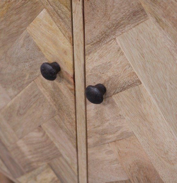 - Połączenie nowoczesności i stylu retro w jednym meblu. Piękna, dwudrzwiowa komoda otwierana za pomocą czarnych uchwytów to skandynawski design w oryginalnym wydaniu. Drewniane fronty odwzorowują parkiet ułożony w jodełkę.